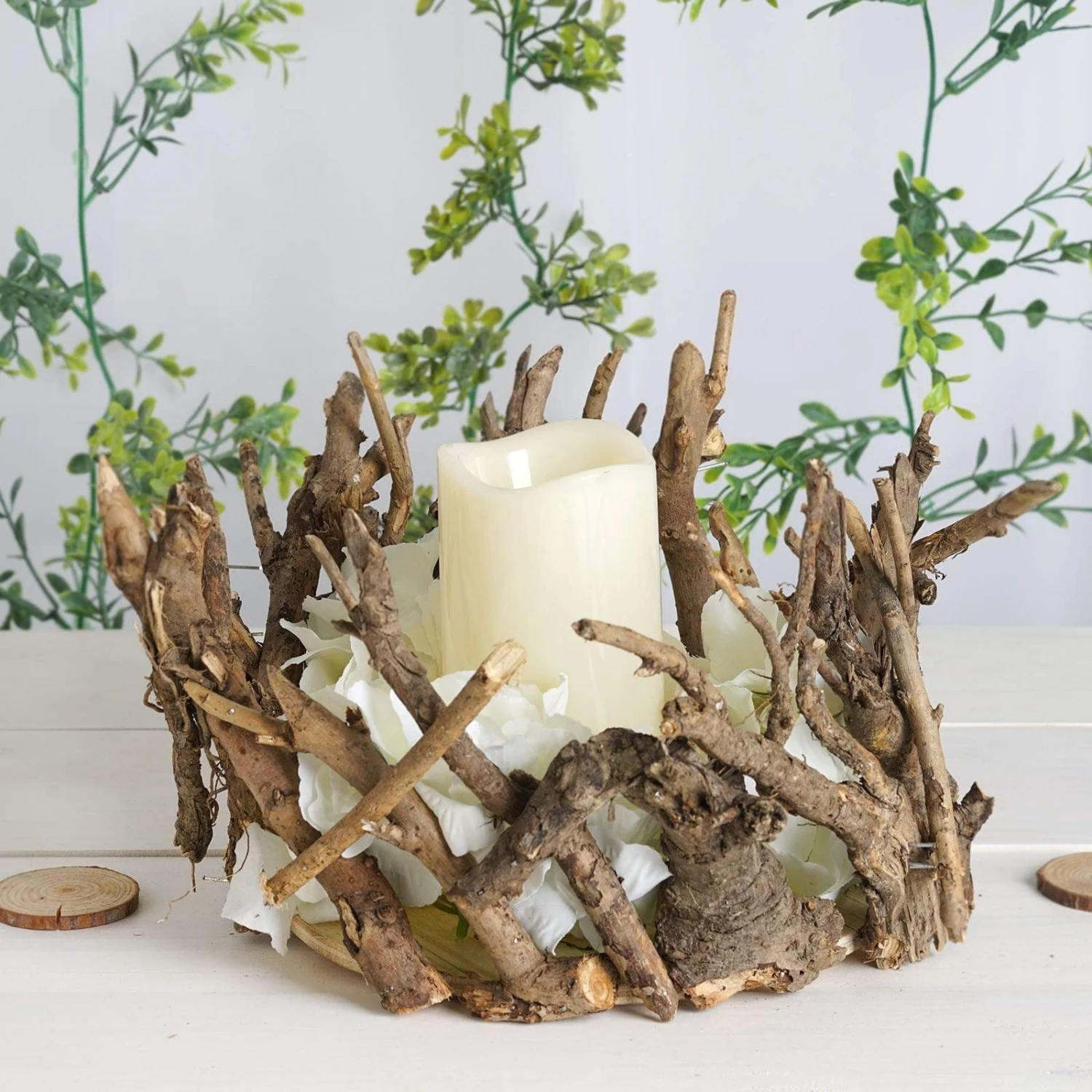 A rustic and functional design for this natural wood candle holder vase allows a charming glow to shine through. This 11″ wide centerpiece is handcrafted from natural wood with a solid vase to hold your candles, flowers, succulents, plants and more! From weddings, events, and parties, to adding a special warm touch to your home, this candle holder vase will compliment woodland or traditional decor and will bring an eye-catching rustic look to your celebration. It also makes a wonderful gift for weddings, holidays and anniversaries.