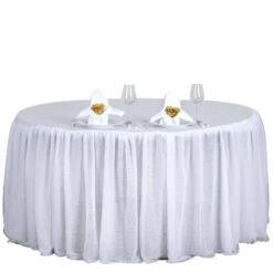 Elevate the look of your reception tables with elegant round tablecloths from Leilani Wholesale! Crafted from high quality taffeta fabric with a crinkled design and metallic touch, this 120″ round textured tablecloth will create a stylish table decoration. Pair these stylish linens with matching napkins and dinnerware to add an extra decorative touch to your party table setting. Perfect for weddings, parties, events or any special occasions.