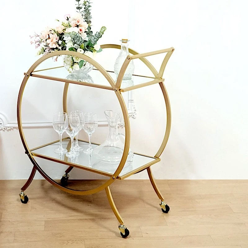 Have a convenient and elegant way to serve your food and drinks with bar carts from Leilani Wholesale! Crafted from high quality metal with mirror glass panels, this 2-tier round bar cart will create a modern look for your living room or kitchen. This stylish trolley cart is designed with a handle and 4 smooth wheels that make it easy to move around. It will also work perfectly as a serving tray, coffee cart, end table for your home or as a decorative stand for your wedding, parties and events.