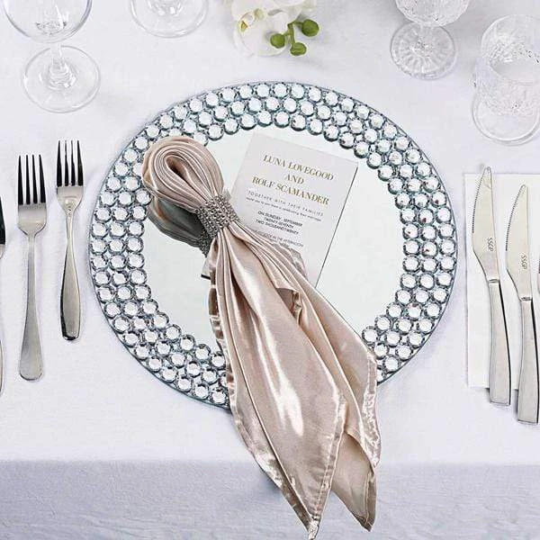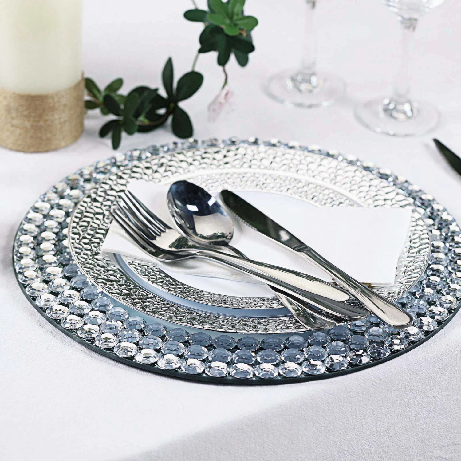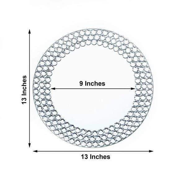 Accent your tables with stylish charger plates for weddings, parties, and special events. Premium glass charger plates with a diamond beaded rim will enhance the appearance of your reception tables. They are easy to clean, just wipe with damp cloth or sponge. Great to use with fine china and to protect the linens from the plates and bowls.