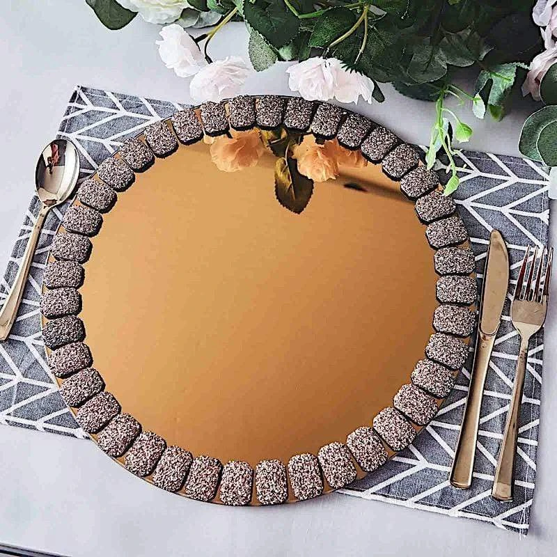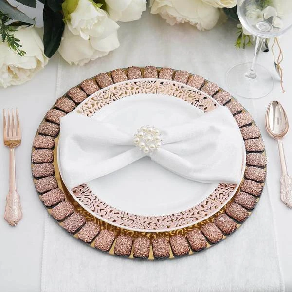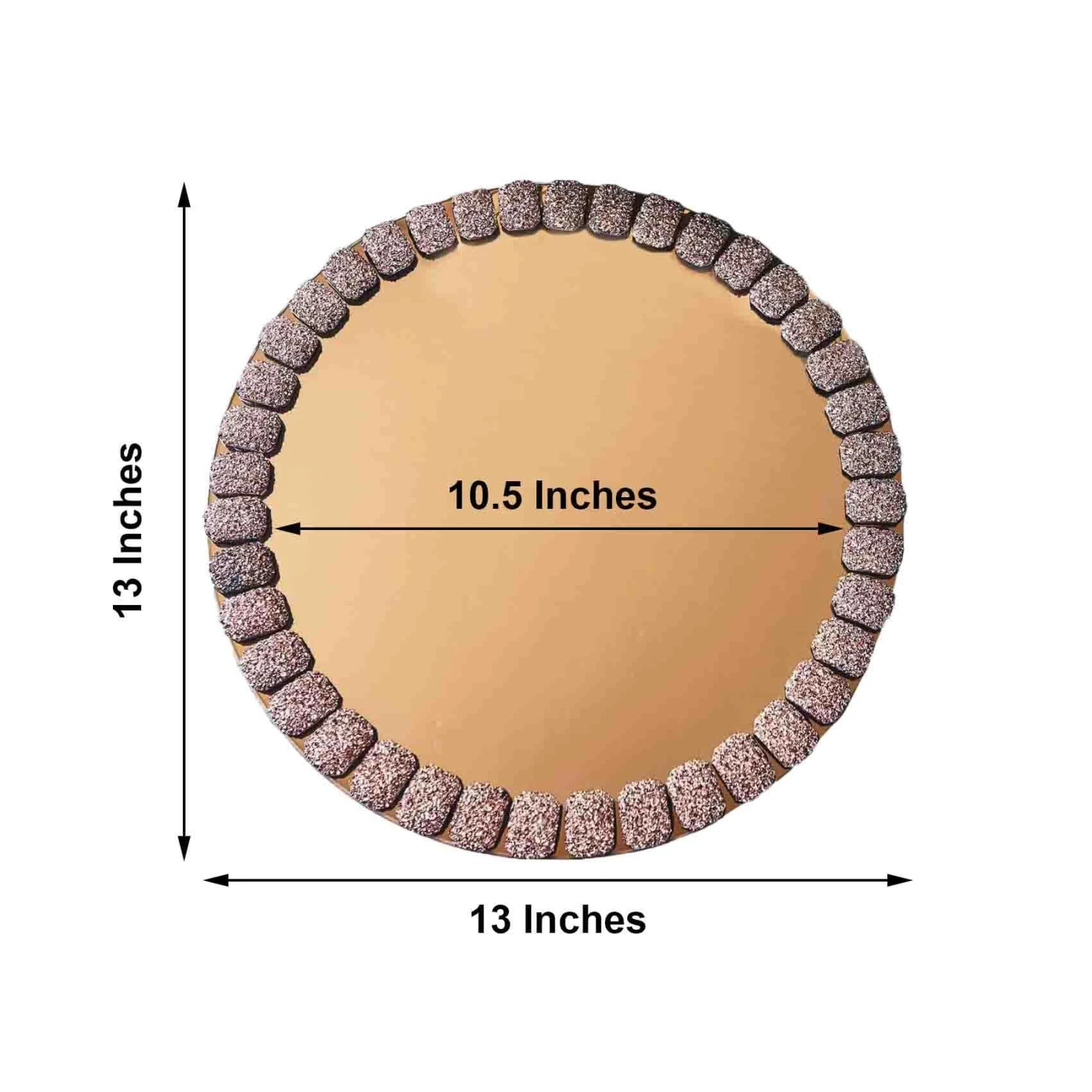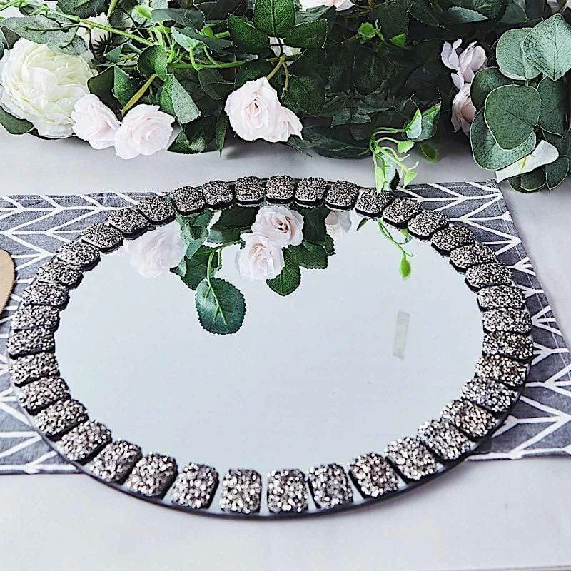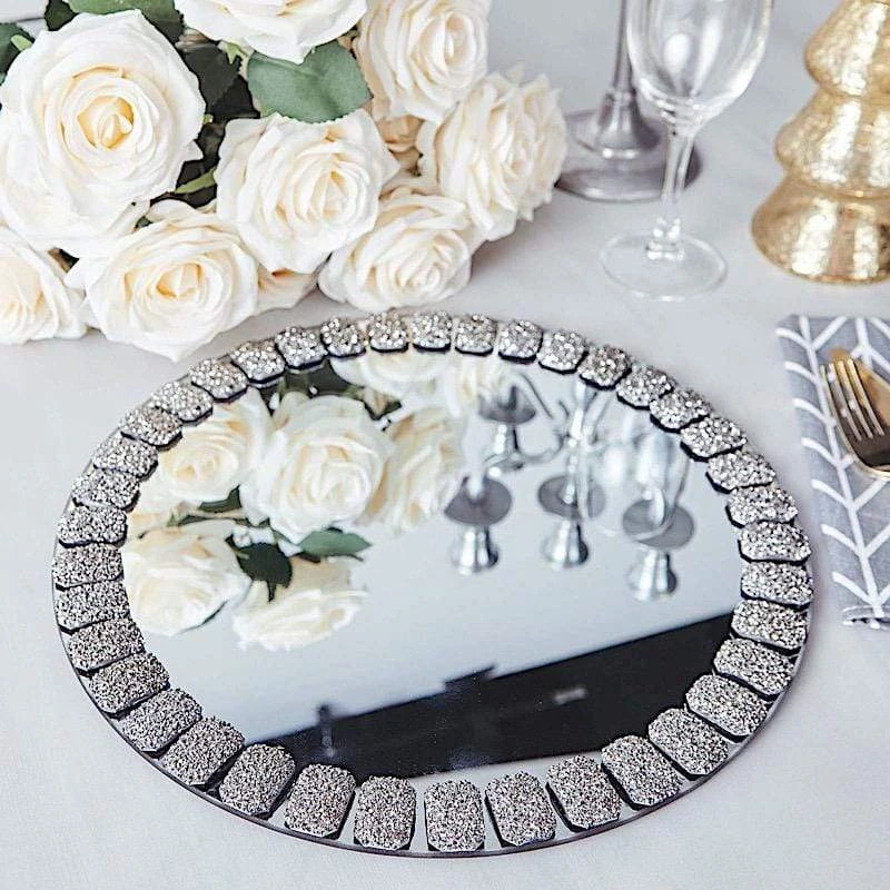 Accent your tables with stylish charger plates for weddings, parties, and special events. Premium glass charger plates with glittered crystals trim will enhance the appearance of your reception tables. They are easy to clean, just wipe with damp cloth or sponge. Great to use with fine china and to protect the linens from the plates and bowls.