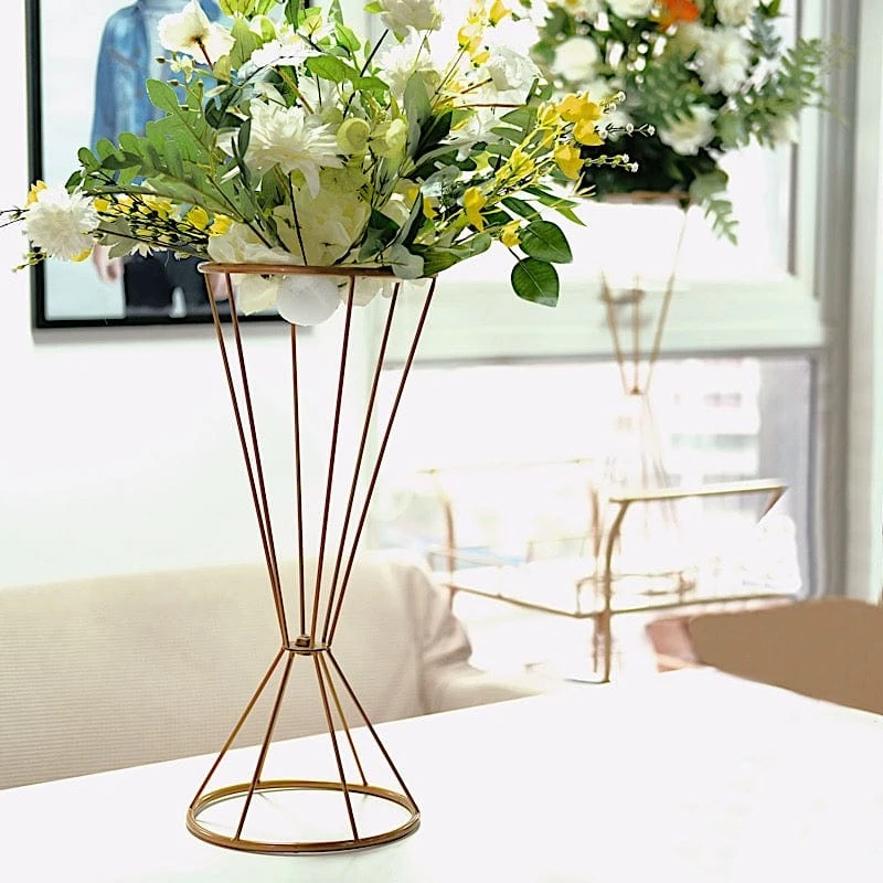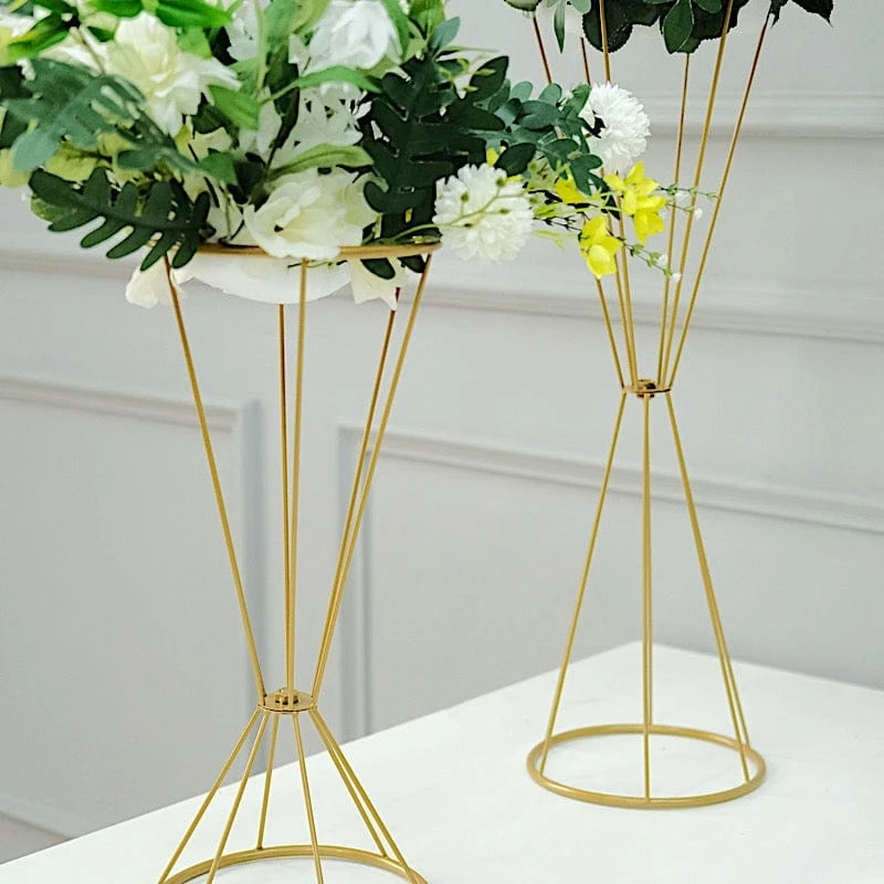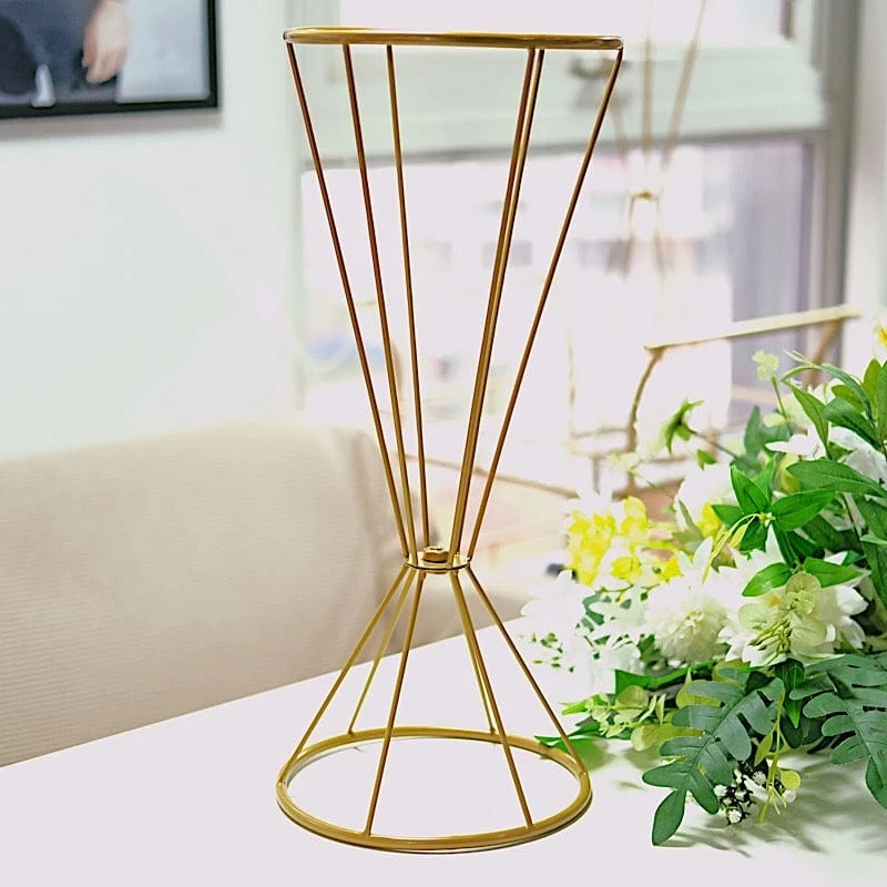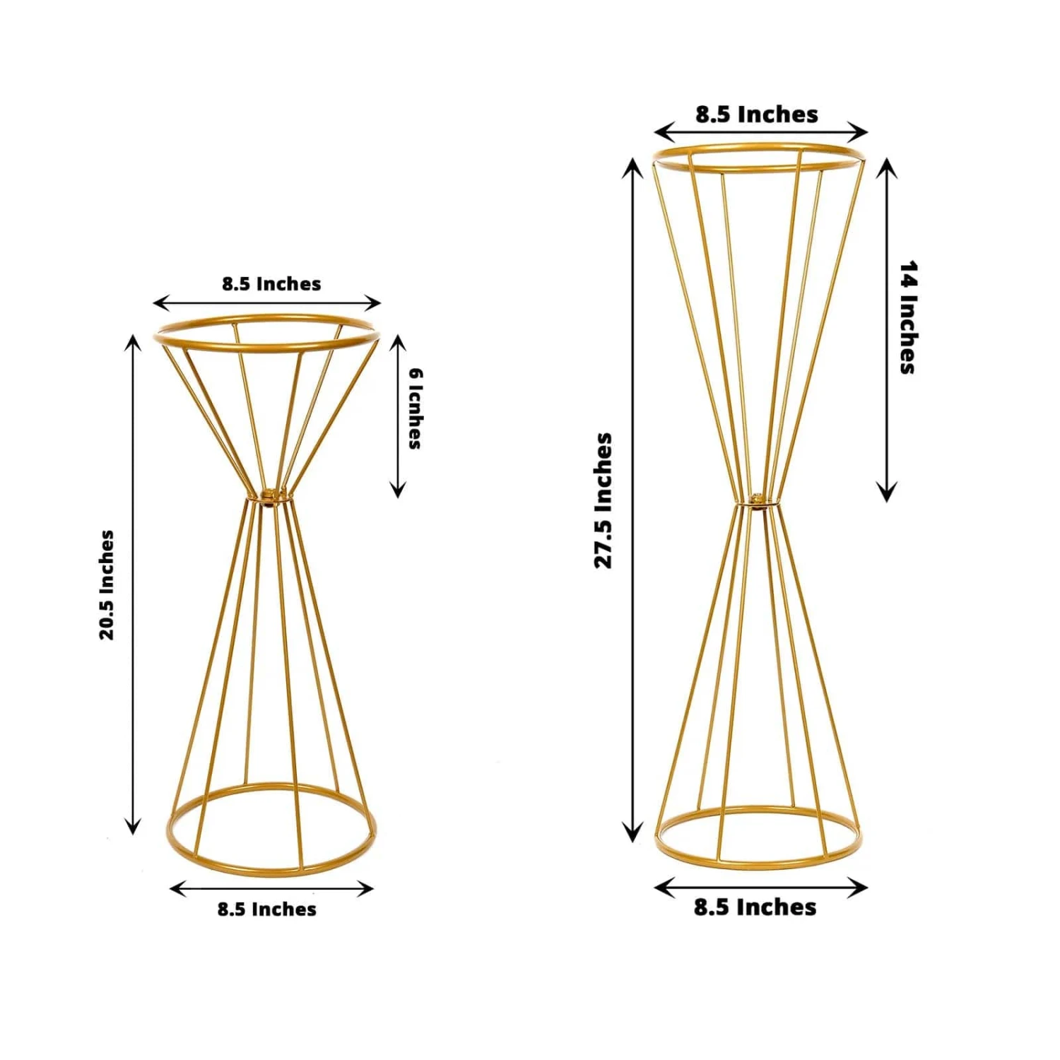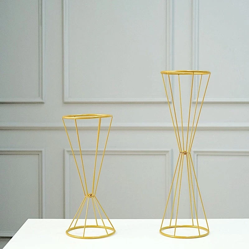 Make artistic centerpieces for your celebration with gold metal flower stands from Leilani Wholesale! Constructed in a contemporary geometric dual cone shaped design, these modern pedestals will be perfect for showcasing your gorgeous flowers or greenery. Perfect as centerpieces for your wedding, parties, events or any special occasions. Use them as everyday decorations for your kitchen table, dining table or coffee table for an eye-catching display for your home. The styling possibilities are endless!