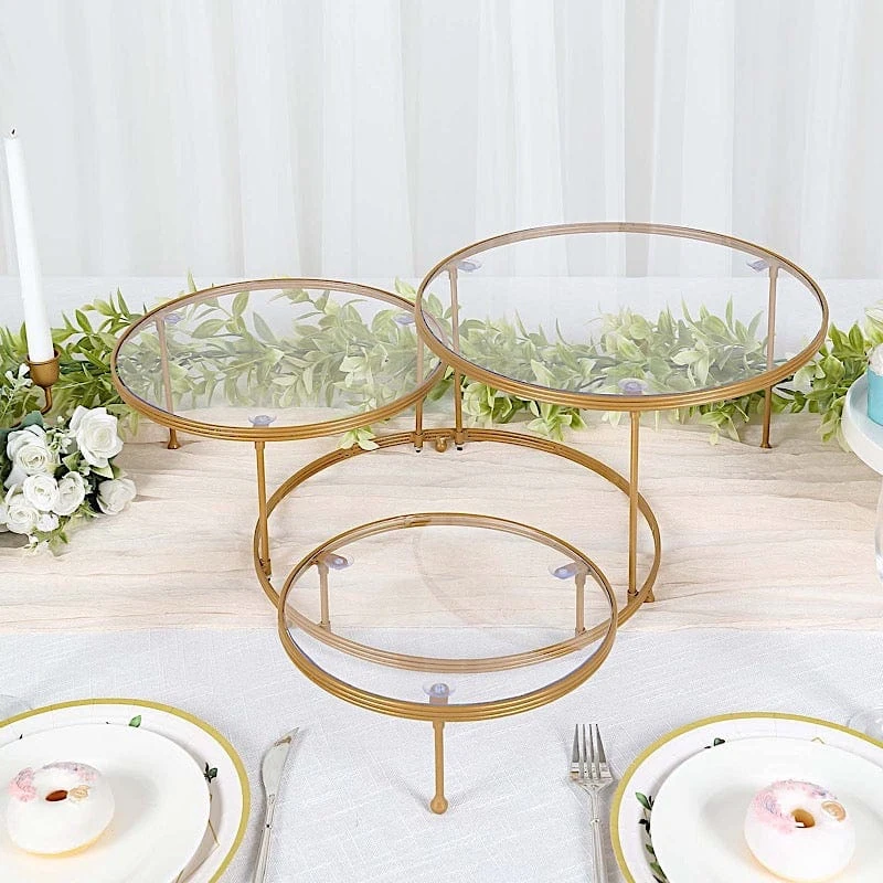 Present your sweets and cupcakes on an elegant dessert stand from Leilani Wholesale! Featuring round acrylic plates on 3-tier high-quality metal frames with varying heights, this stylish stand is sure to create the perfect cake and cupcake displays for your dessert tables. Use it to present your sweets in style or to add space, height and a more sophisticated look to your tables. This multipurpose cake stand can also be used as a base to display elegant candles, flowers or any decorative item. Great for weddings, parties, events or any special occasions.