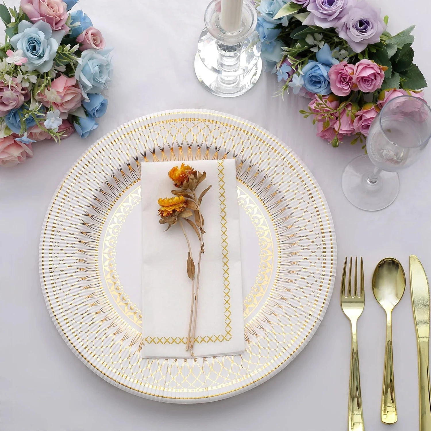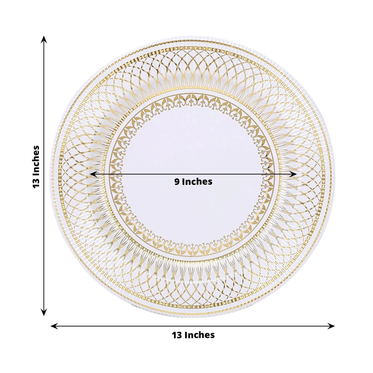 Accent your party tables with sparkling round paper charger plates from Leilani Wholesale! Created from high quality cardboard with a vintage design, these lightweight chargers will enhance the look of your reception tables. Use them to serve your food, desserts and more. These charger plates can also be used to highlight your elegant tableware or to protect the linens from plates and bowls. Make cleaning up a snap with these disposable paper charger plates!