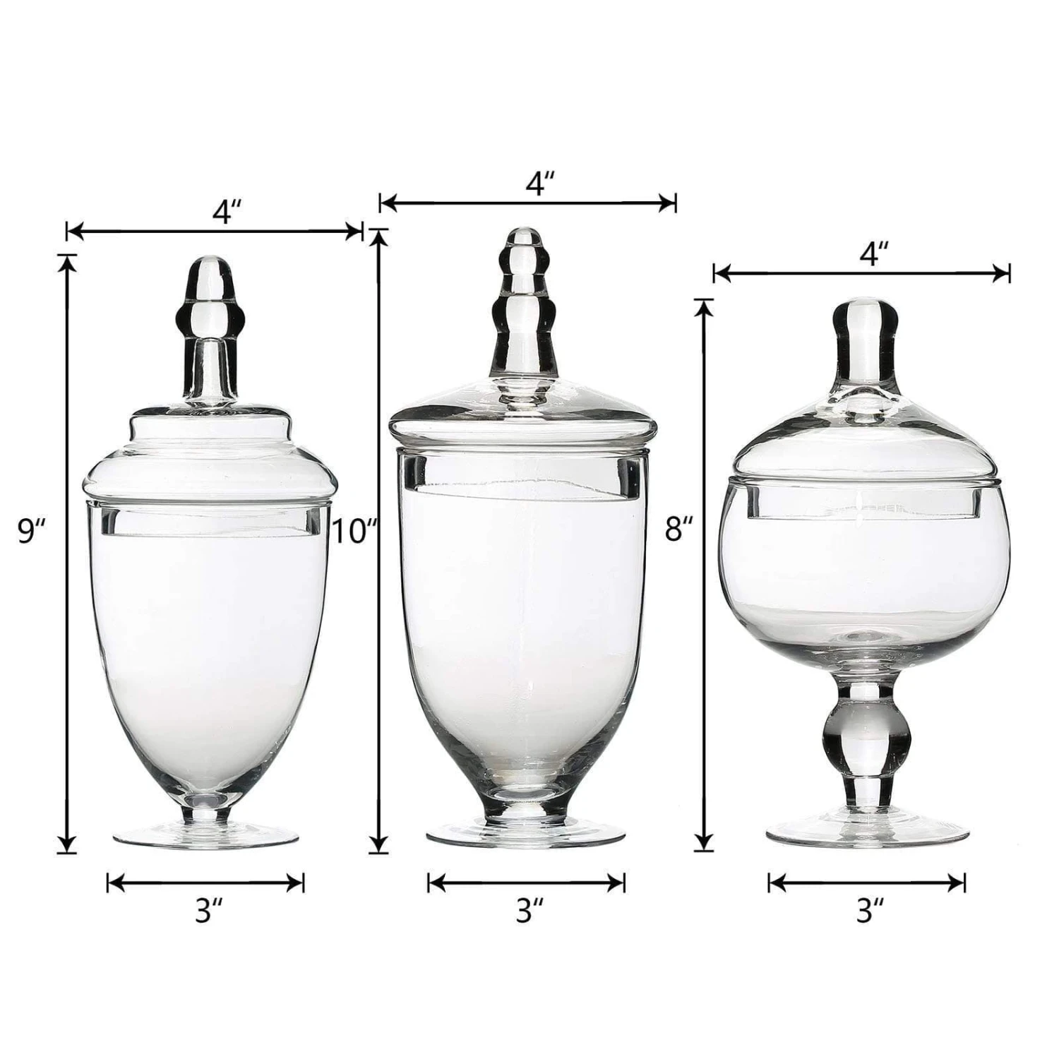 These cute apothecary jars offer a variety of uses for your party or home. With 3 jars per order, there’s plenty of favors and decorations to add to your party decor. Create a cute candy buffet or use them as a decorative accent filled with succulents, chocolate, or fillers! It can also be used to organize bathroom soaps, cotton balls and cotton swabs. Perfect for weddings, birthdays, and themed parties. Give them as hostess gift filled with your homemade treats – the possibilities are endless!