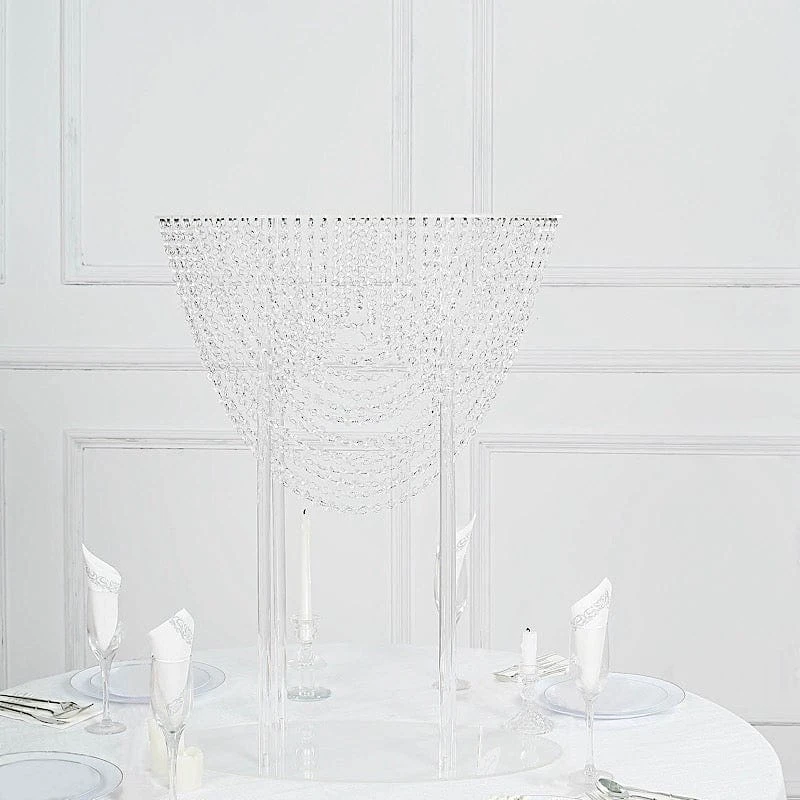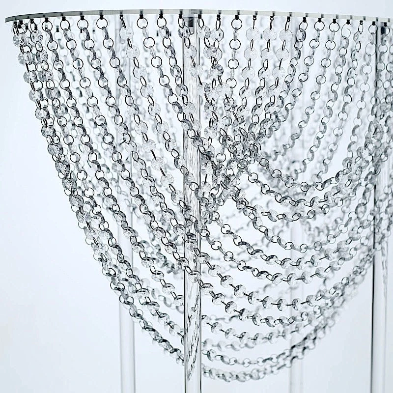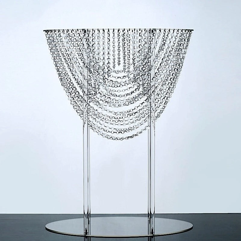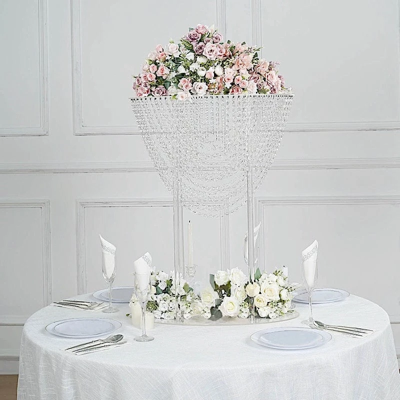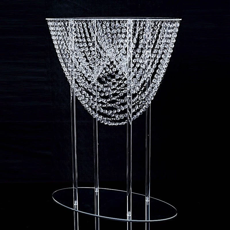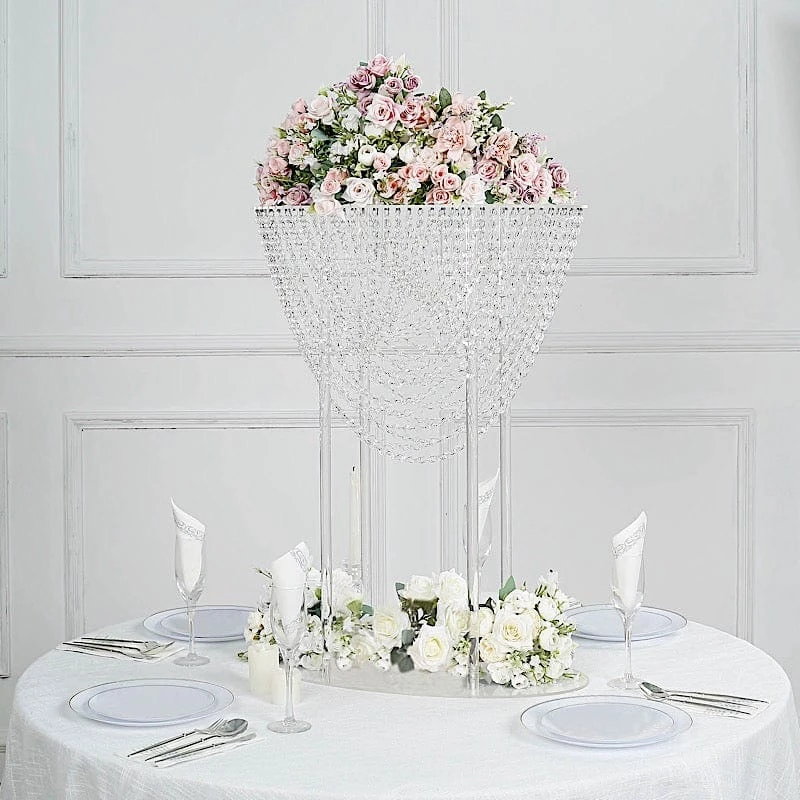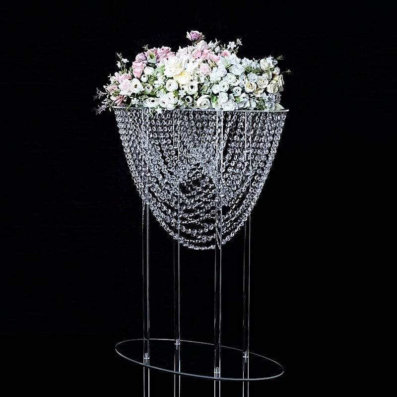 Make sparkling centerpieces for your celebration with acrylic flower stands from Leilani Wholesale! Designed with an oval-shaped top and base, slender poles and accented with hanging crystal beads, this modern pedestal will be perfect for showcasing your gorgeous flowers or greenery. Perfect as a centerpiece or decor for your wedding, parties, events or any special occasion. Use this chandelier flower stand as an everyday decoration for your dining table or living room for an eye-catching display for your home. Get your dream decoration and see where your imagination takes you!