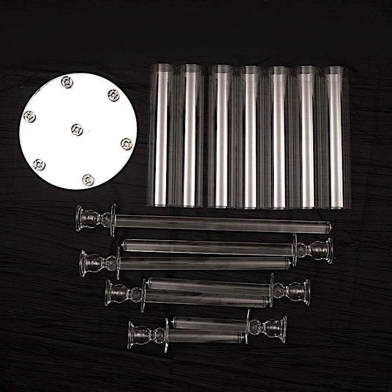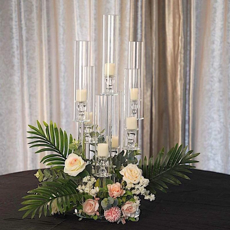 Add a touch of timeless elegance to your room with candelabra candle holders from Leilani Wholesale with a design that is both beautiful and functional. This 33″ tall crystal-like candelabra candle holder is made with a round mirror base, slender stems with varying heights, and removable hurricane glass shades to support your taper, pillar, votive or LED candles. Use it as a centerpiece to spot light your table or mantle at home or pair it with other decorations for your weddings, parties, events or any special occasions. Get your dream decorations and see where your imagination takes you!
