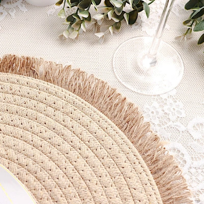 Elevate the dining experience and charm your guests with stylish placemats from Leilani Wholesale! Crafted from cotton and jute, these round placemats with fringed edges offer a rustic, decorative accent to event tablescapes. Perfect for special occasions or everyday use, these placemats can be used as a base for your elegant, tableware and centerpieces. Have fun with them and see where your imagination takes you!