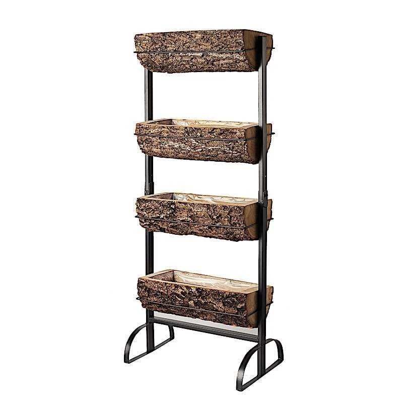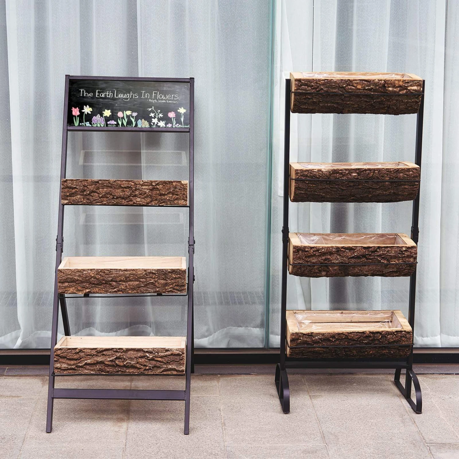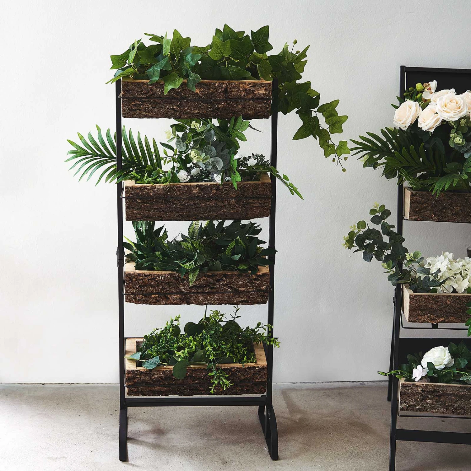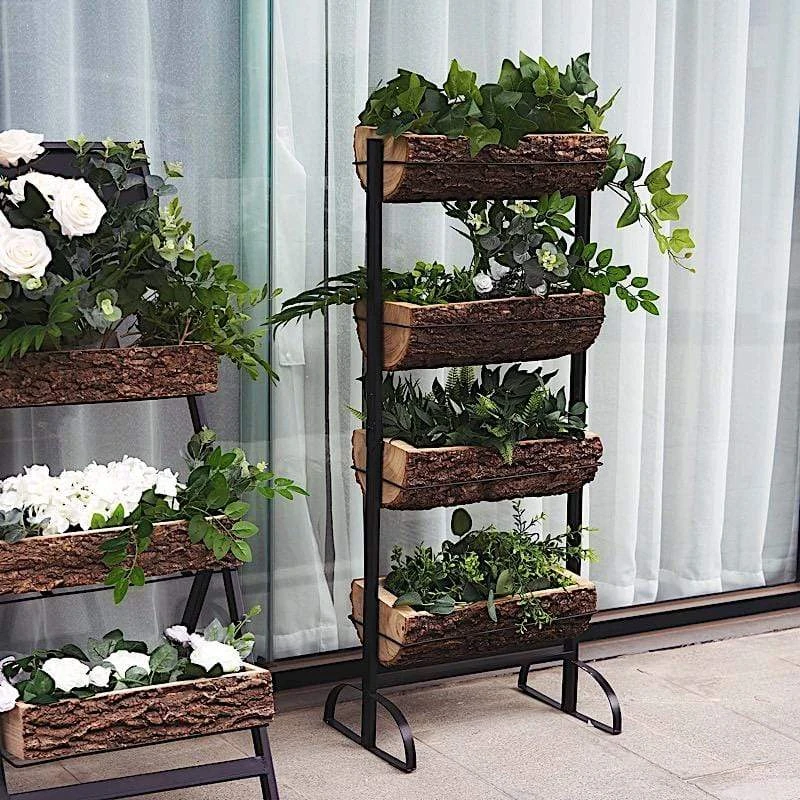 Have the perfect home for your blooming flowers and refreshing greenery with planter stands from Leilani Wholesale! This attractive 4-tier stand will give a rustic touch to your balconies, hallways, kitchen, living room or any dull spaces in your home or party setting. The combination of sturdy metal rack and natural wood planter makes this planter stand as a perfect addition to your home or office decor. Perfect for weddings, parties, events or any special occasion.