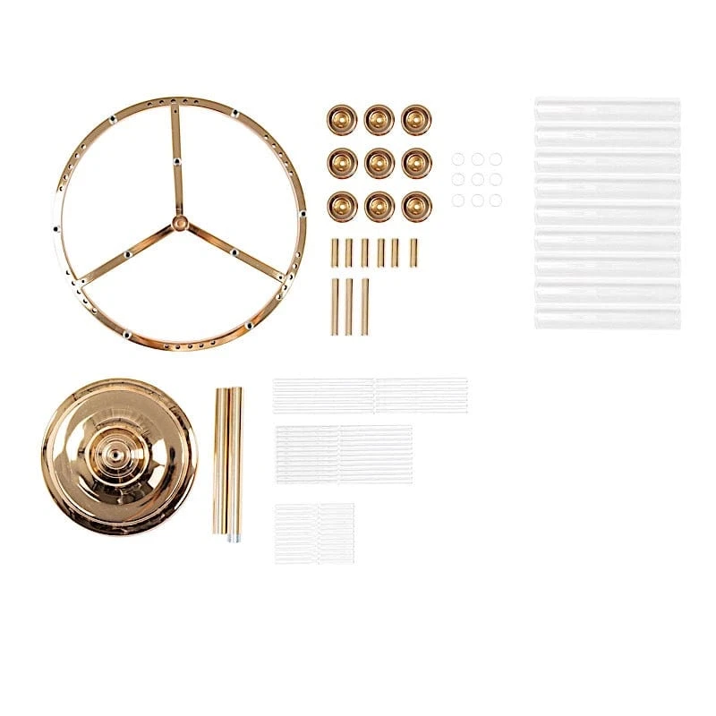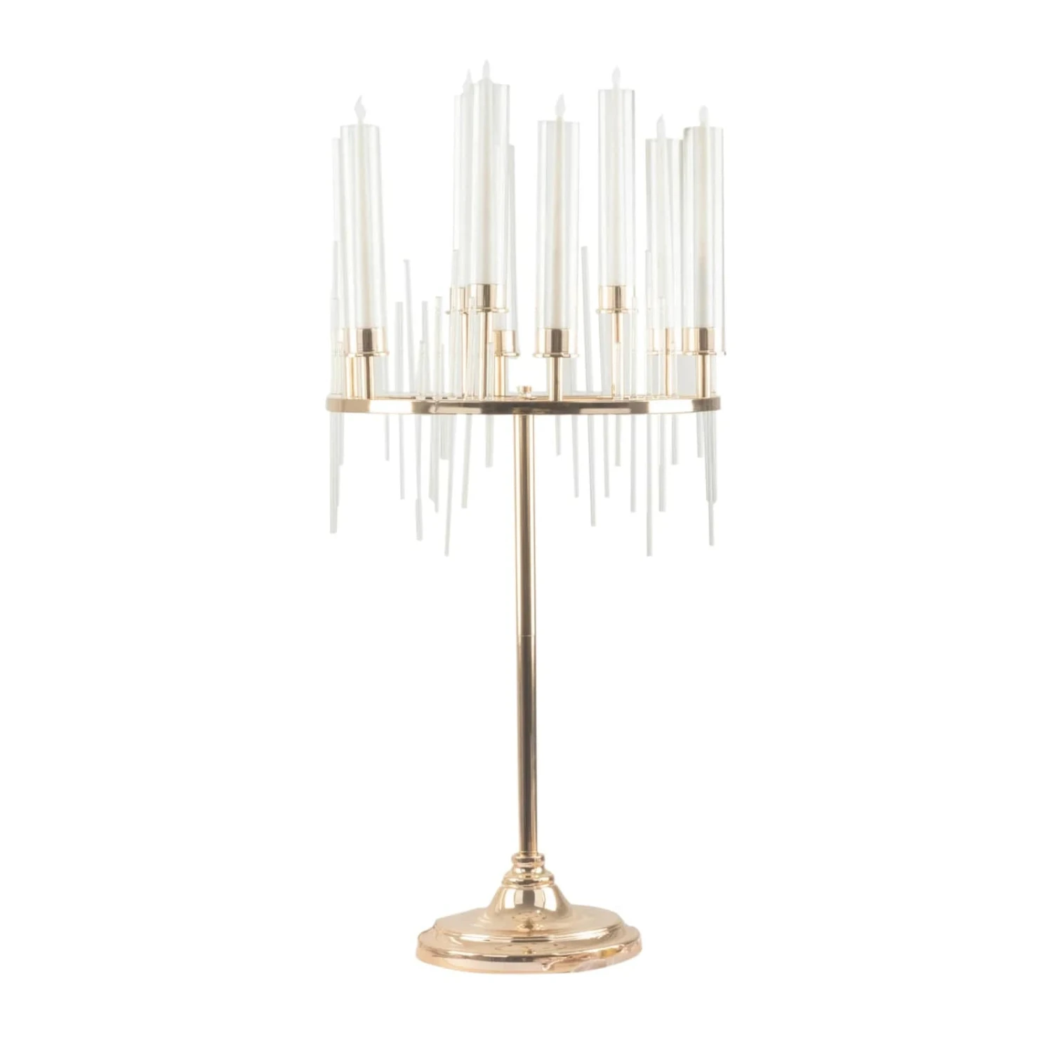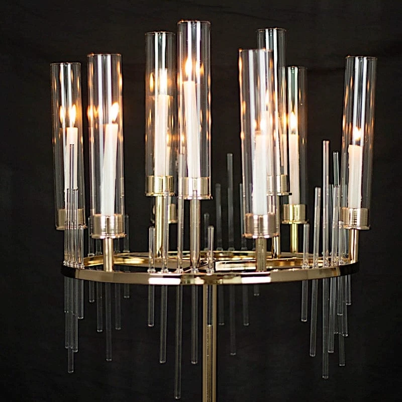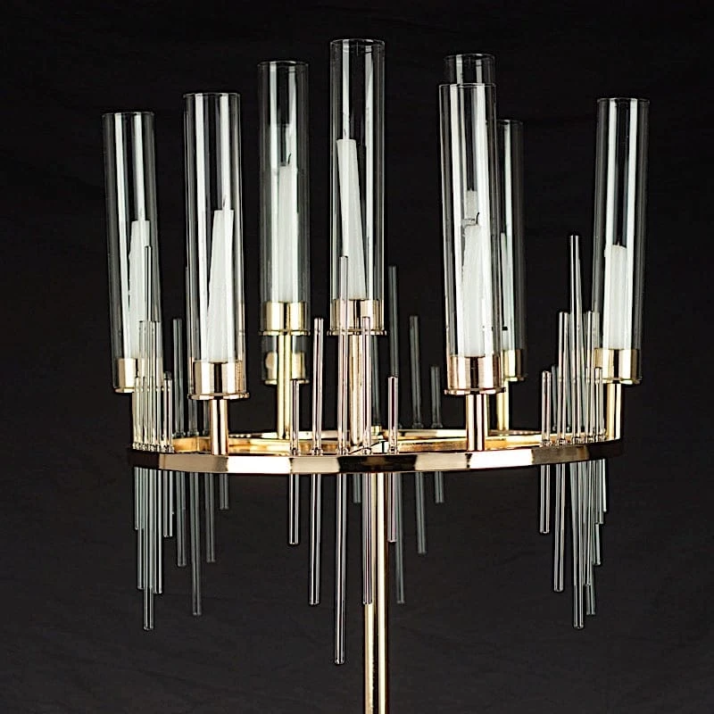 Add a touch of timeless elegance to your tabletop with candelabra candle holders from Leilani Wholesale. This 40″ tall metal candle holder is designed with a round top frame with drip-like glass bar accents and 9 round glass shades to secure your taper candles. A perfect centerpiece to grace your reception tables! Use it as a decoration for your weddings, parties, events, special occasions and for your home. Get your dream decorations and see where your imagination takes you!