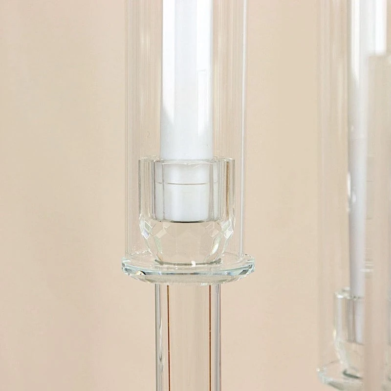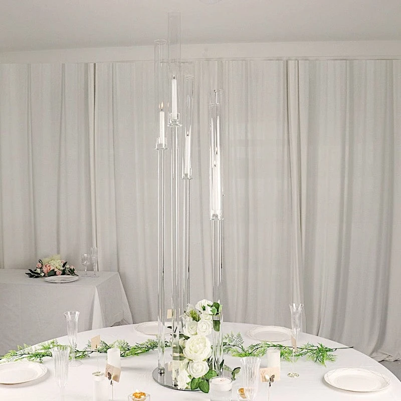 Add a touch of timeless elegance to your tabletop with candelabra candle holders from Leilani Wholesale. This 51″ tall crystal-like glass candle holder is designed with a round base, stems with varying heights and 5 round glass shades to secure your taper candles. A perfect centerpiece to grace your reception tables! Use it as a decoration for your weddings, parties, events, special occasions and for your home. Get your dream decorations and see where your imagination takes you!