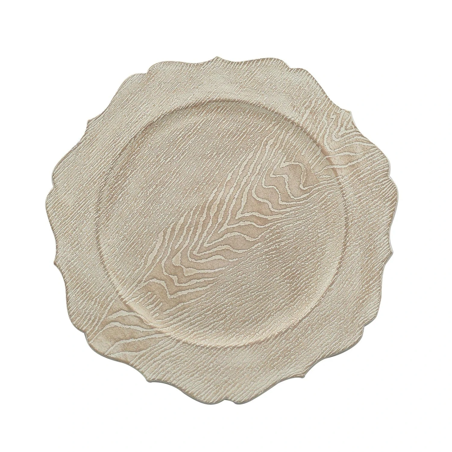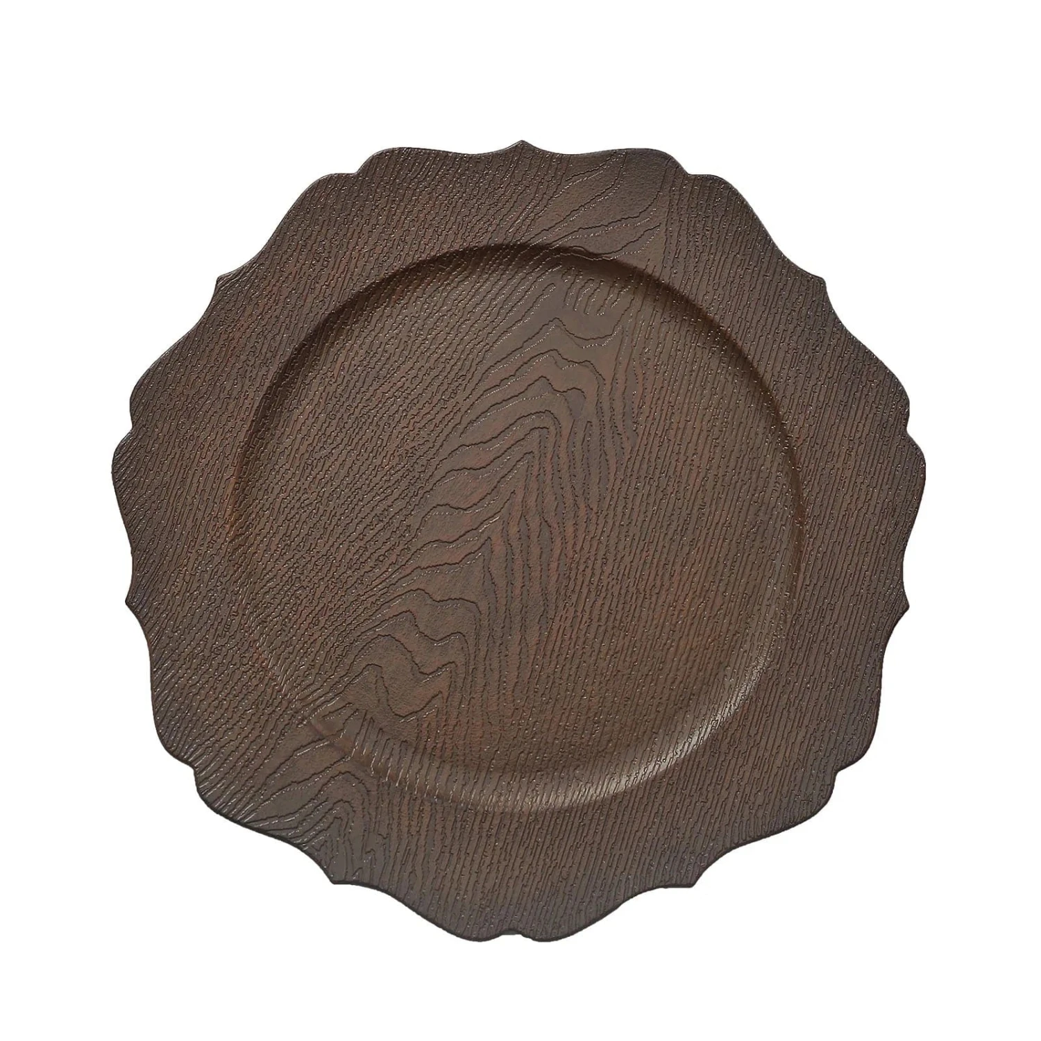 Accent your party tables with acrylic charger plates from Leilani Wholesale! Featuring a scalloped rim design, these rustic wooden textured charger plates will enhance the appearance of your reception tables. They are easy to clean, just wash them with hot water. Great to use with fine china and to protect the linens from the plates and bowls.