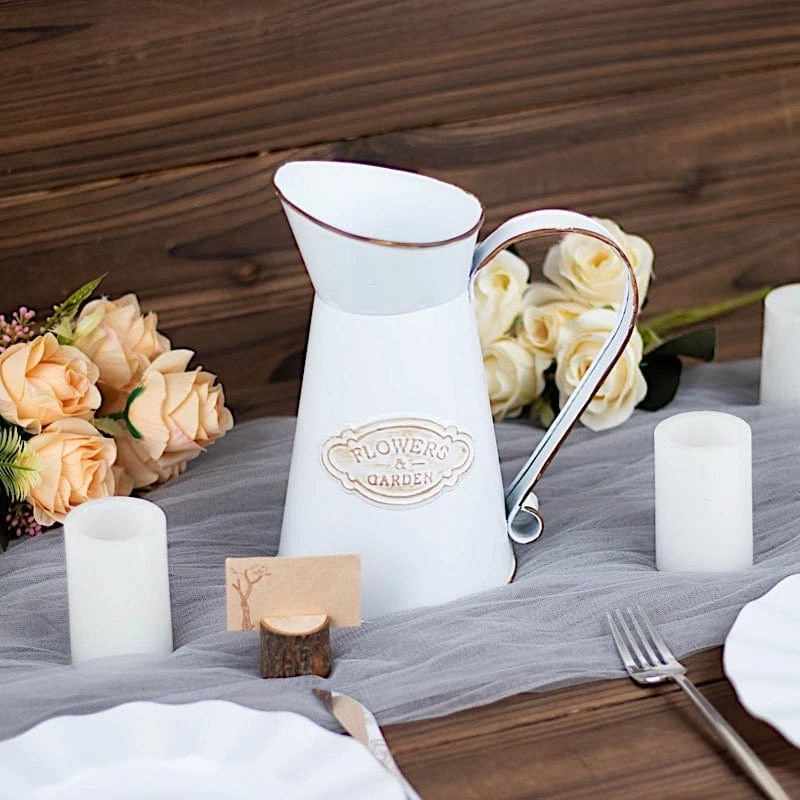 Add a rustic touch to your party decorations with this vintage water pitcher centerpiece from Leilani Wholesale! Constructed from high quality metal with a handle and “Flowers & Garden” printed design, this centerpiece will create a country-style look for your special occasions. Use this multipurpose water pitcher alone as a decorative piece for your balcony, garden, living room, kitchen or any space in your home or fill it with flowers and greenery to create an eye-catching centerpiece for your rustic theme weddings, parties and events. Get your dream decorations and see where your imagination takes you!