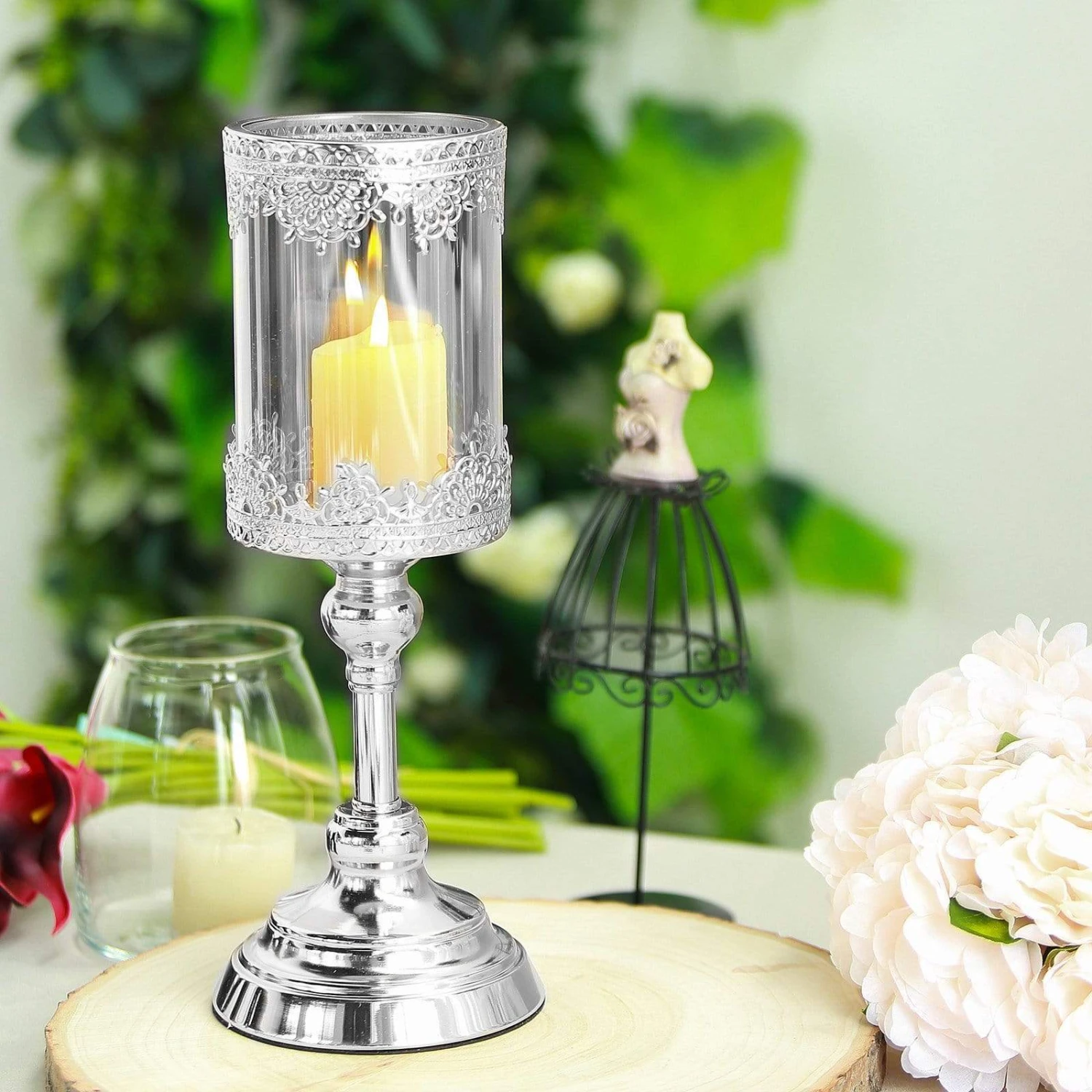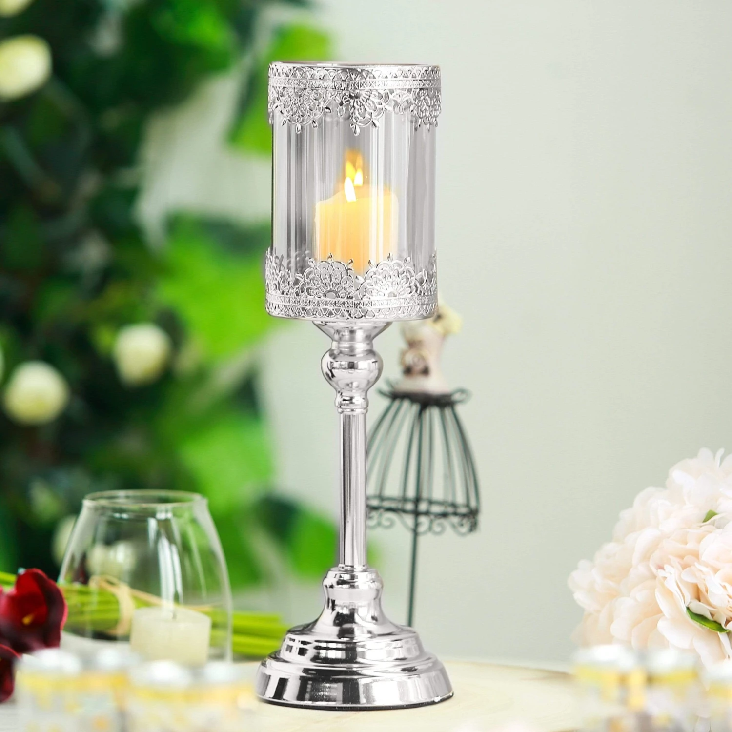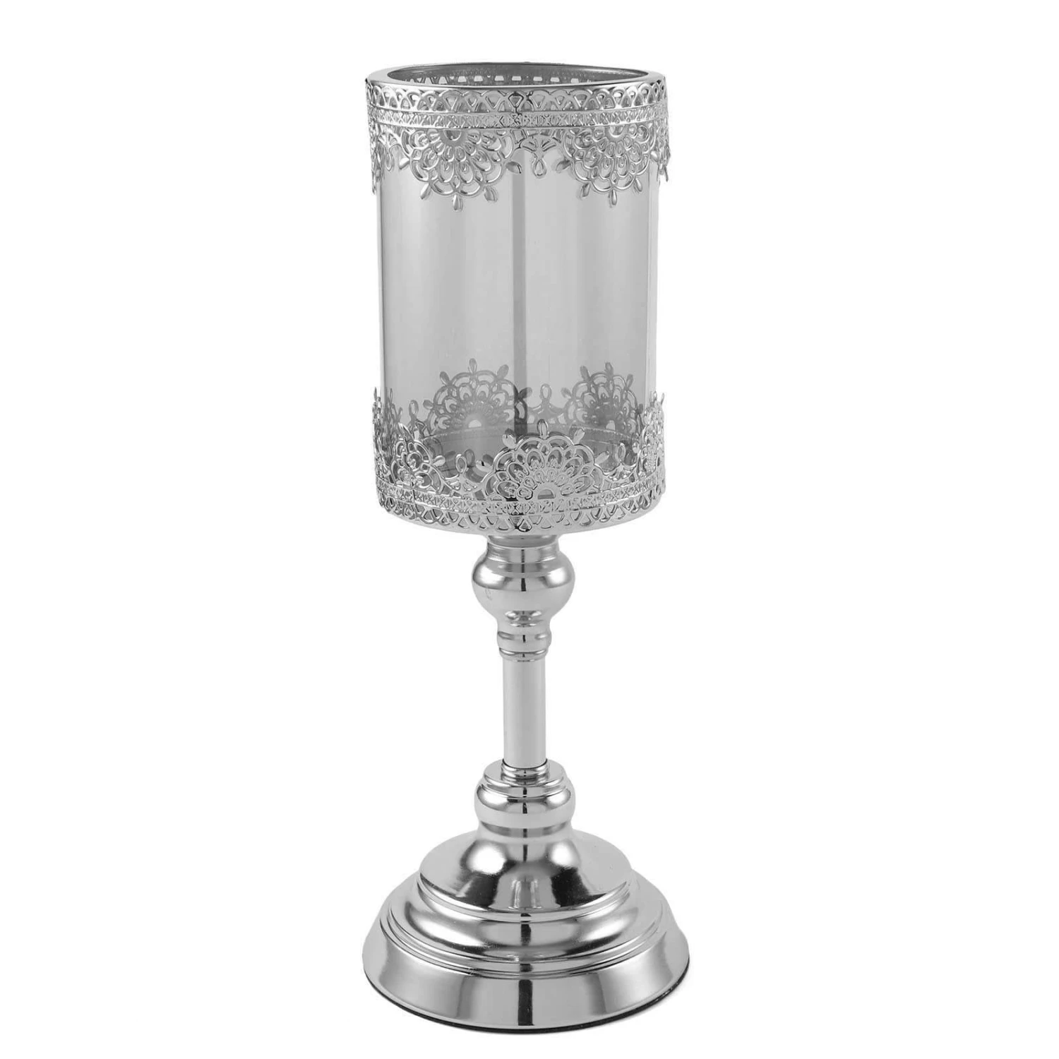 Add an extra warm glow to your party or home with this 13″ tall candle holder from Leilani Wholesale. A design that is both beautiful with intricate details and functional will shine as you light your, up to 6” long, pillar candles. Removable glass shade allows to use either pillar candles or tea lights. From weddings, events, and parties, to adding a special touch to your home, this candle holder will surely bring an elegant touch to your celebration.