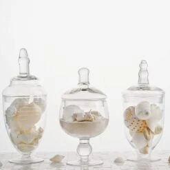 Set Of 3 11″ 16″ 18″ Tall Glass Apothecary Jars Containers With Lids – Clear With Gold Trim