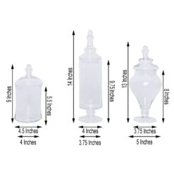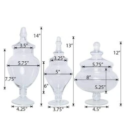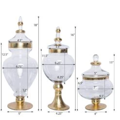 Set Of 3 11″ 16″ 18″ Tall Glass Apothecary Jars Containers With Lids – Clear With Gold Trim
